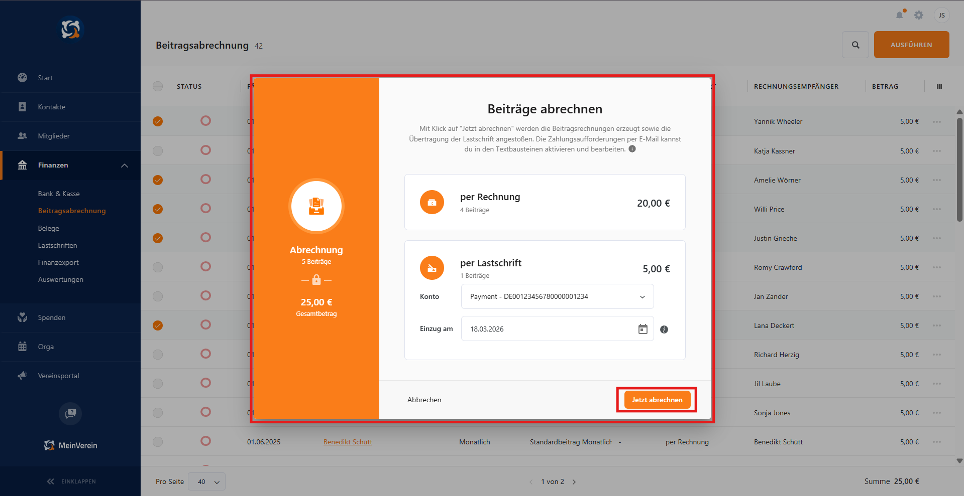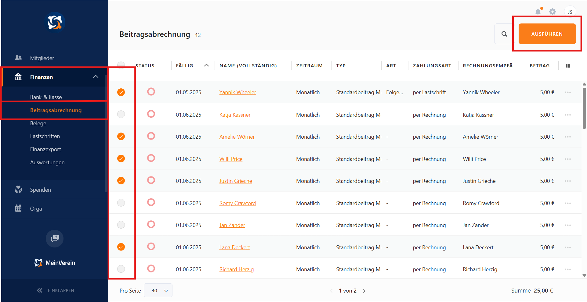 Sobald Beiträge und Bankverbindungen hinterlegt sind, kannst du den Beitragseinzug starten. Öffne dazu den Bereich Finanzen in der Navigation. Dort findest du die Übersicht über die Beiträge. Starte hier den Beitragseinzug für die entsprechenden Mitglieder, nachdem du sie ausgewählt hast.