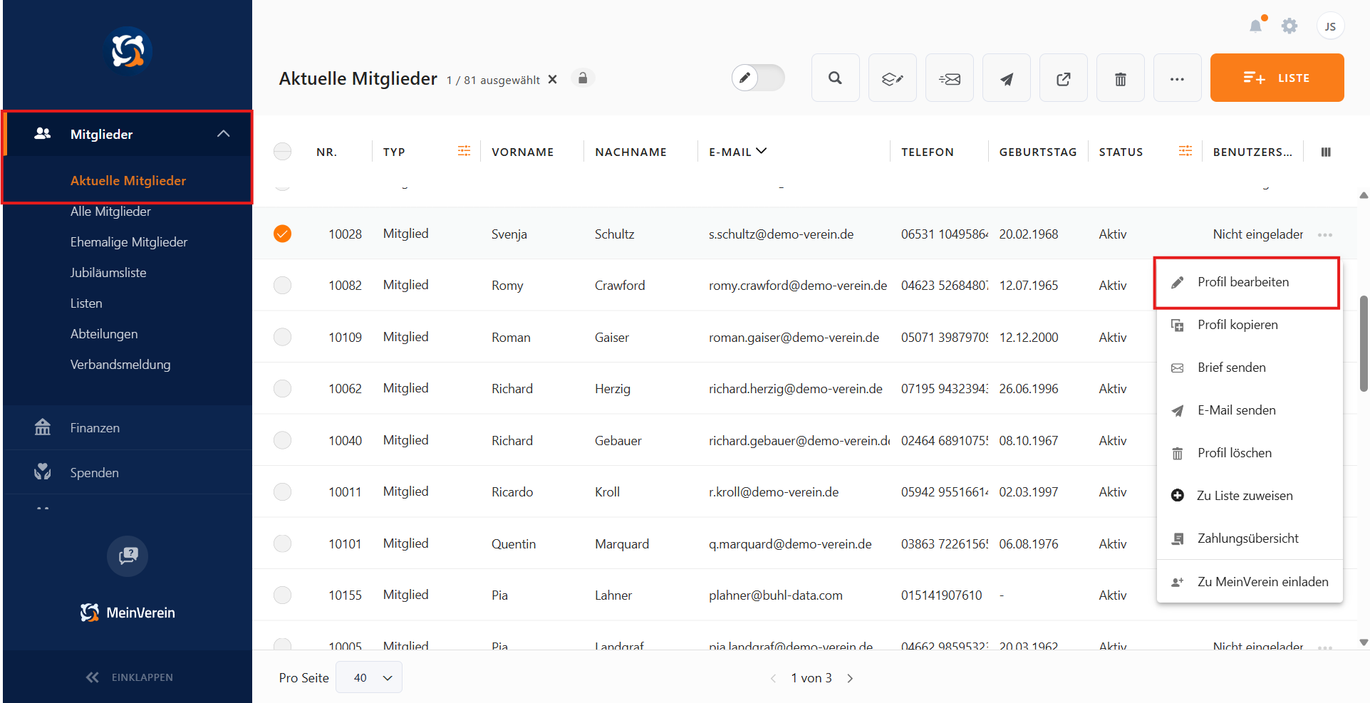 Nachdem du die Beitragsstruktur angelegt hast, kannst du die Beiträge den Mitgliedern zuweisen. Öffne dazu in der Navigation den Bereich Mitglieder und wähle Aktuelle Mitglieder aus. Suche anschließend das Mitglied, dem du einen Beitrag zuweisen möchtest, und öffne das entsprechende Profil über das Drei-Punkte-Menü rechts im Profil.