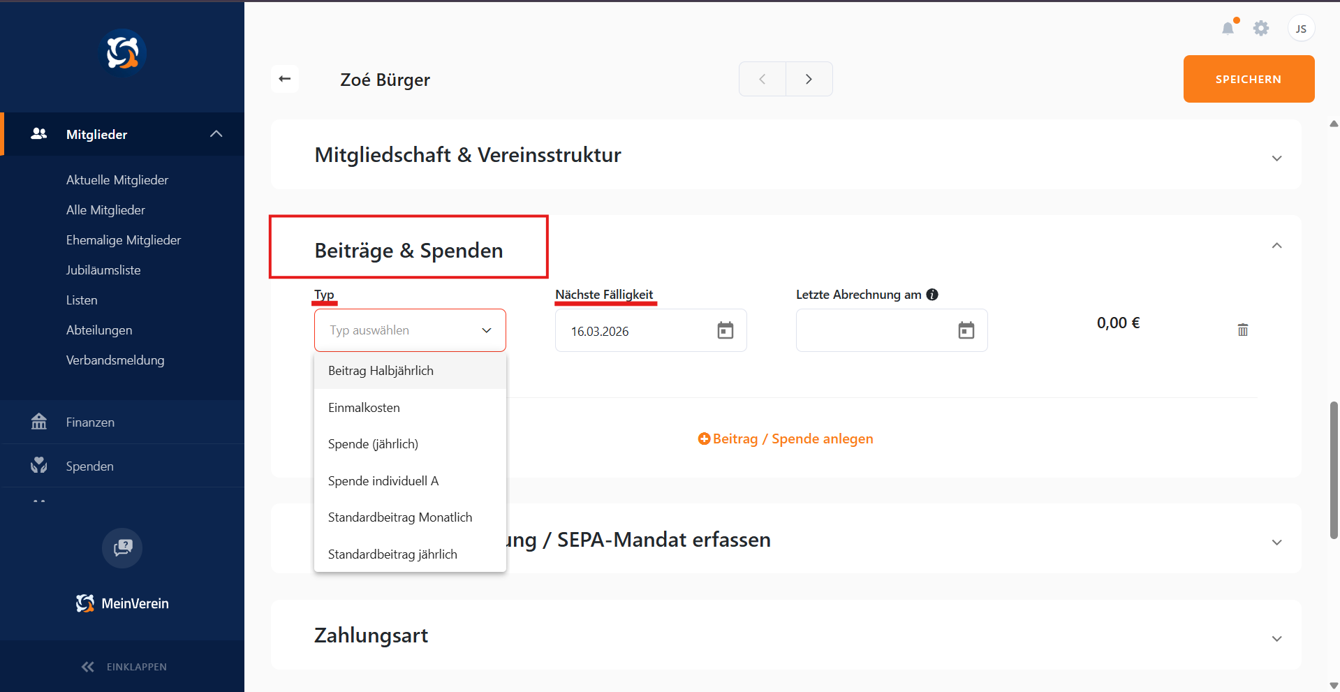Im Mitgliederprofil kannst du nun den zuvor angelegten Beitrag auswählen und dem Mitglied zuweisen. Trage den Beitrag im entsprechenden Feld ein und speichere anschließend deine Änderungen. Dadurch wird der Beitrag dem Mitglied zugeordnet und kann später beim Beitragseinzug berücksichtigt werden.