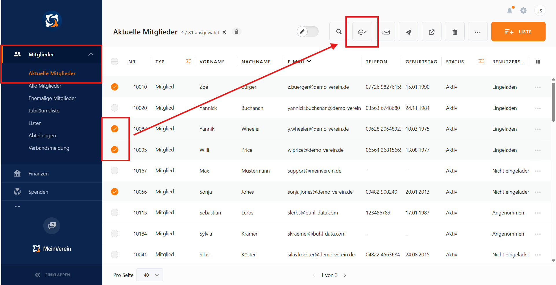 Wenn mehrere Mitglieder denselben Beitrag erhalten sollen, kannst du Beiträge auch gleichzeitig für mehrere Mitglieder hinterlegen. Öffne dazu die Mitgliederliste im Bereich Mitglieder und Kontakte und markiere die entsprechenden Mitgliederprofile über die Auswahlkästchen in der Liste.
