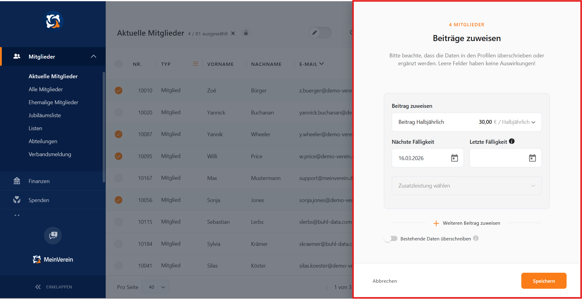 Nachdem du die gewünschten Mitglieder ausgewählt hast, kannst du über die Massenänderung den Mitgliedsbeitrag gleichzeitig mehreren Mitgliedern zuweisen. Wähle dazu die entsprechende Option im Menü rechts aus und hinterlege den Beitrag für alle ausgewählten Mitglieder.
