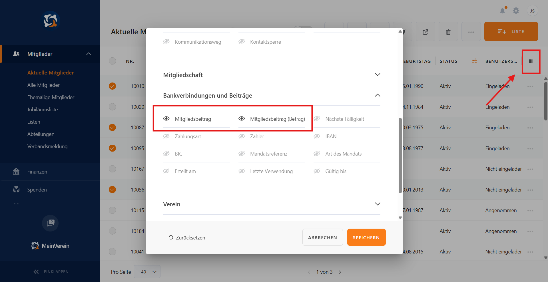 Um schneller zu überprüfen, welcher Beitrag bei welchem Mitglied hinterlegt ist, kannst du die Spalte Mitgliedsbeitrag in der Mitgliederliste einblenden. Öffne dazu die Spaltenauswahl in der Mitgliederübersicht und füge die entsprechende Spalte hinzu.