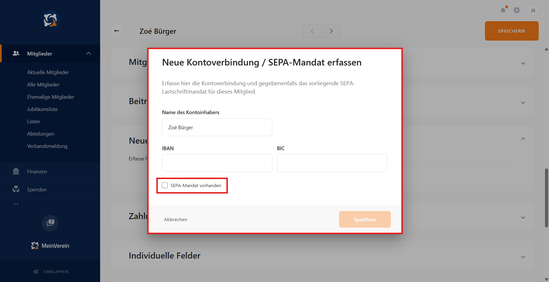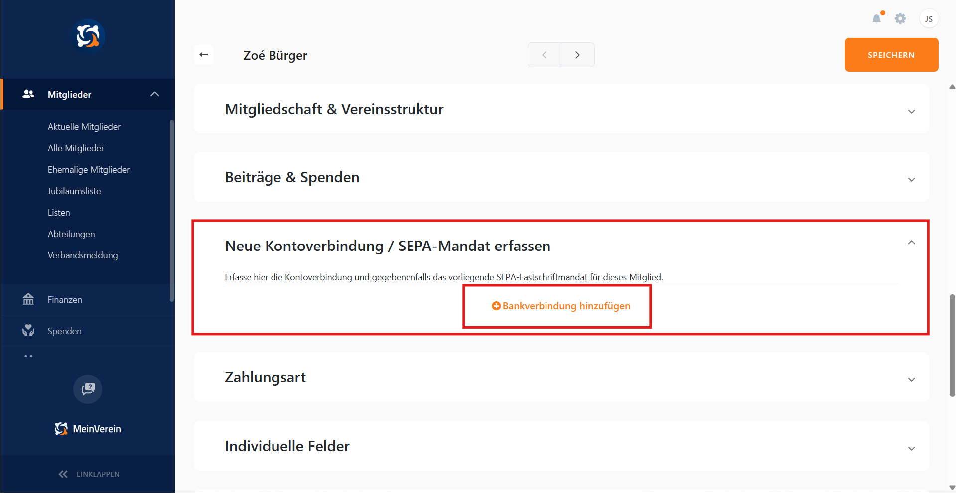 Damit Beiträge per Lastschrift eingezogen werden können, musst du im Mitgliederprofil zusätzlich eine Kontoverbindung oder ein SEPA-Mandat hinterlegen. Öffne dazu erneut das Mitgliederprofil und erfasse dort die Bankverbindung des Mitglieds.