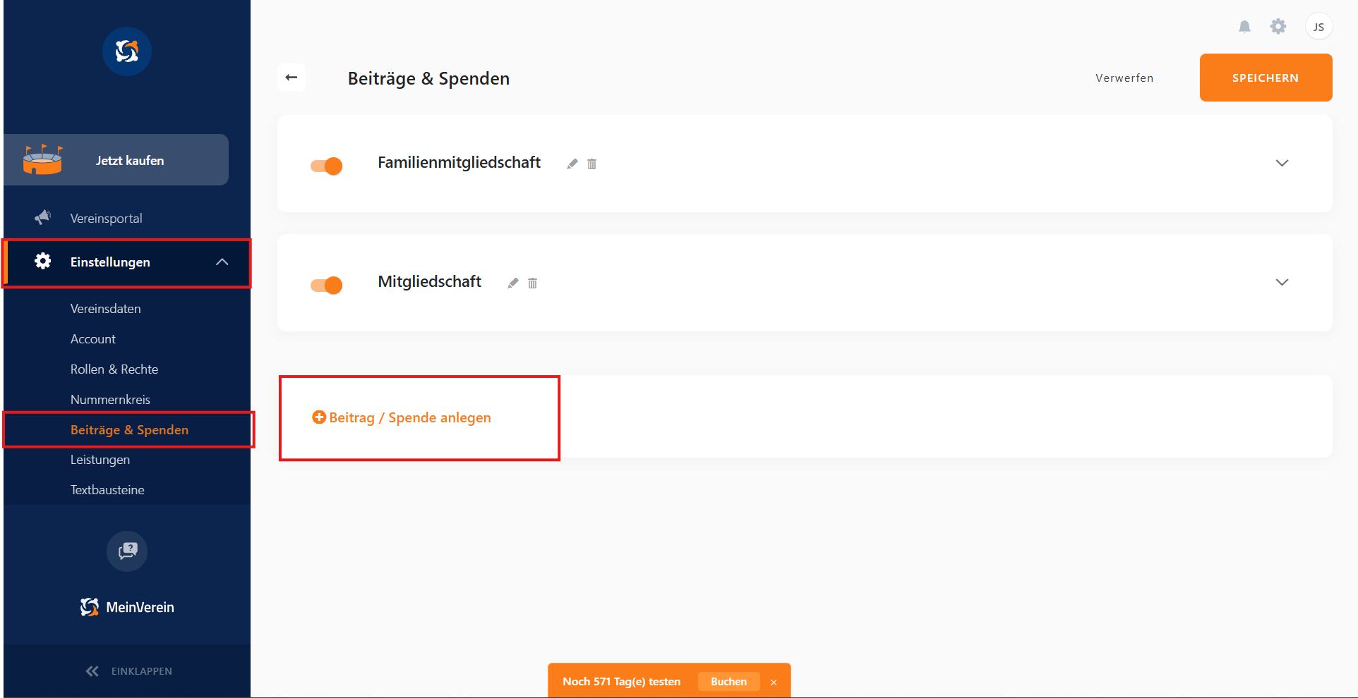 Damit du Mitgliedsbeiträge entsprechend deiner Beitragsstruktur einziehen kannst, sind zunächst einige Voreinstellungen erforderlich. Anschließend kannst du die Beiträge den Mitgliedern zuweisen und den Beitragseinzug durchführen. Öffne zuerst den Menüpunkt Einstellungen in der linken Navigation und wähle dort Beiträge & Spenden aus. In diesem Bereich verwaltest du alle Beiträge und Spenden deines Vereins. Um einen neuen Beitrag anzulegen, klicke oben rechts auf „+ Beitrag/Spende anlegen“. Dadurch öffnet sich die Eingabemaske zum Anlegen eines neuen Beitrags.
