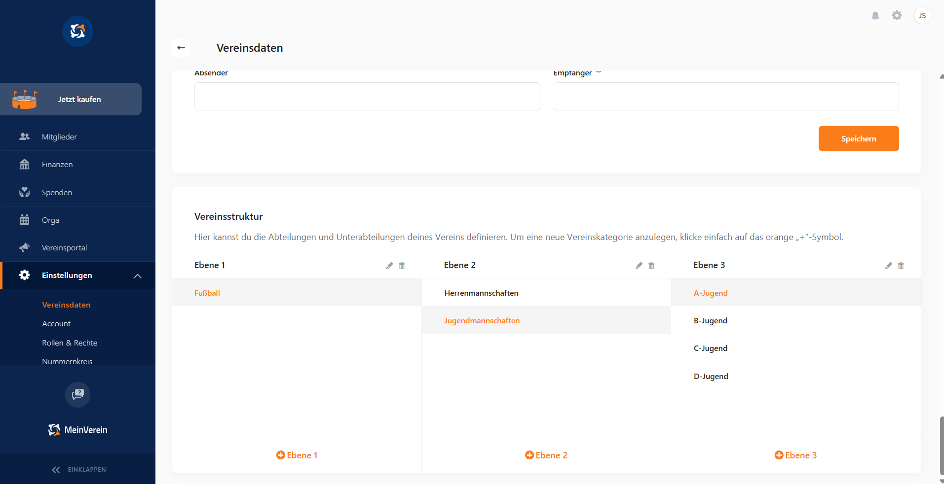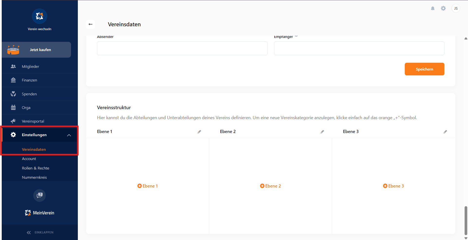 Im Anschluss legst du die verschiedenen Ebenen der Vereinsstruktur fest, dabei klickst du auf + Ebene 1, um die oberste Ebene zu erstellen.