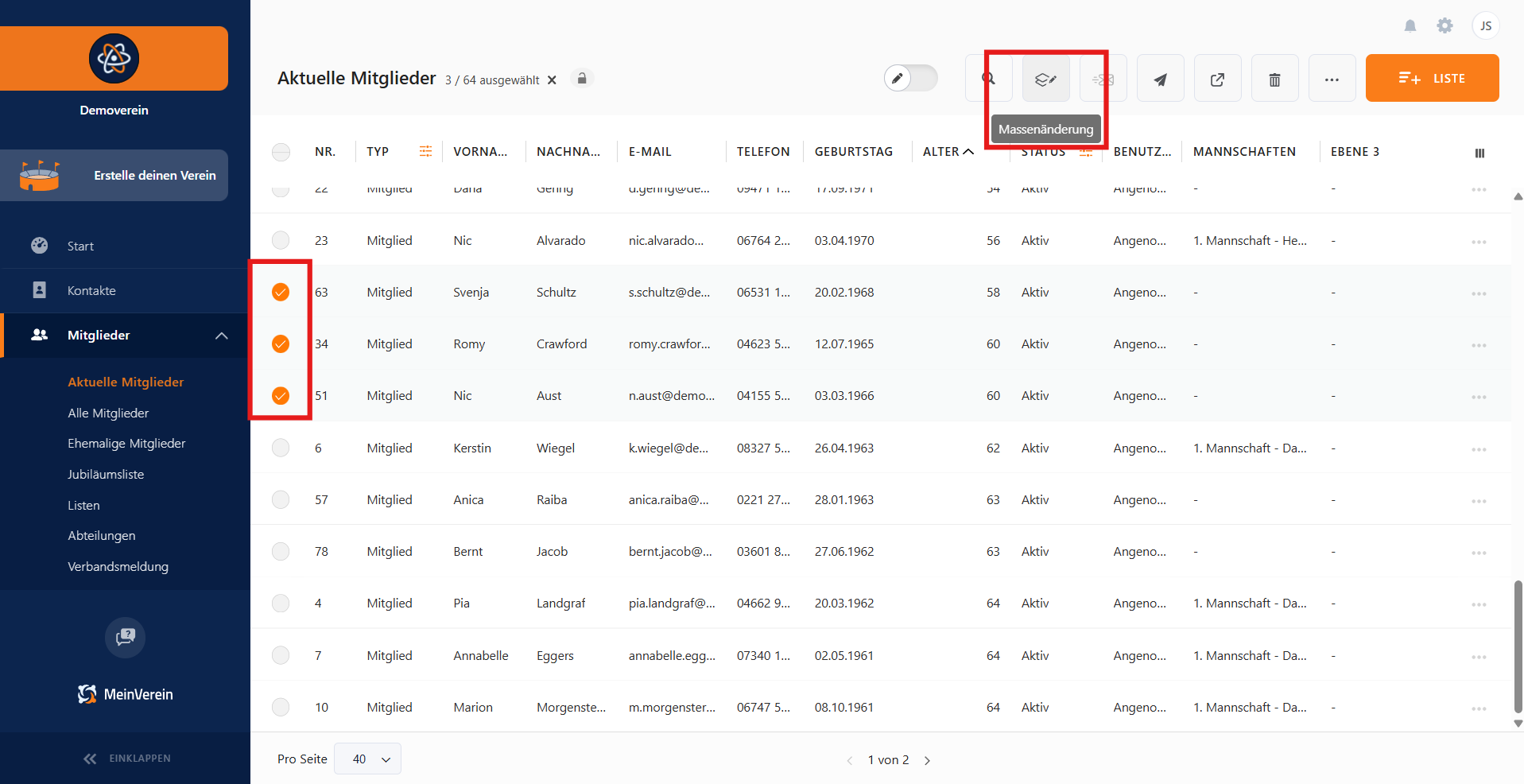 Um mehrere Mitglieder gleichzeitig einer Abteilung zuzuordnen, könnt ihr die Funktion Massenänderung nutzen. Wähle dafür zunächst die gewünschten Mitglieder über die Auswahlfelder auf der linken Seite aus und klicke anschließend in der oberen Leiste auf das Symbol für die Massenänderung.
